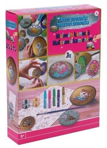 Namaľujte si trblietavé jednorožce na kamene a dozdobte kamienkami podľa fantázie, Sada obsahuje 3 kamienky, štetec, 5 trblietavých farieb, 1 zlatú farbu, 1 striebornú farbu a samolepky.