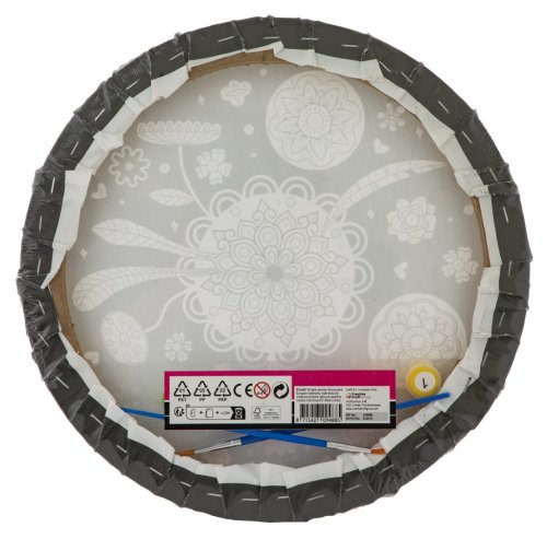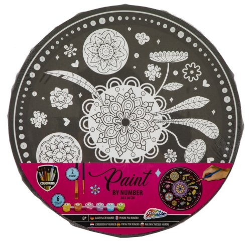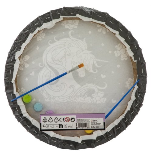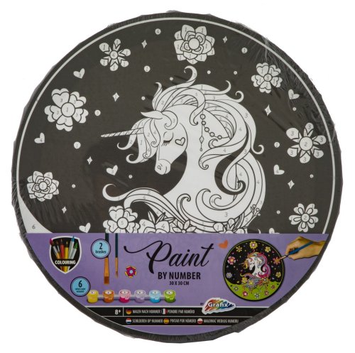 Maľovanie podľa čísel kruhový obrázok 30 cm. Balenie obsahuje obrázok, 6 vodových farebniek, dva štetce - plochý a okrúhly. Dva druhy obrázkov - mandala a jednorožec.