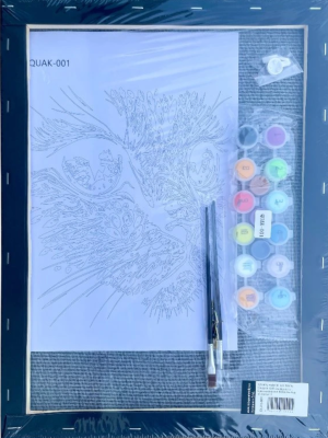 plátno na ráme o veľkosti 30 x 40 cm s obrazovou predlohou s očíslovanými plochami, sadu akrylových farieb, sadu troch rôzne veľkých štetcov.