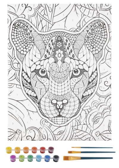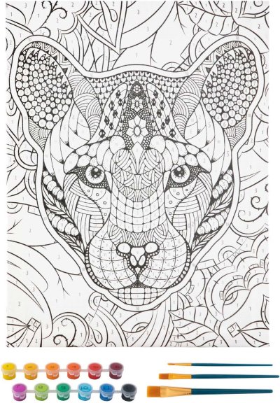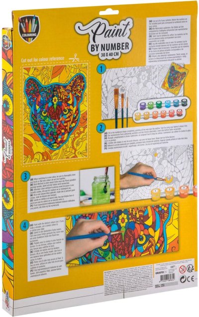 Maľovanie podľa čísel na plátno Tiger 30×40 cm – balenie obsahuje obrázok vytlačený na bavlnenom plátne, 12 farieb a 3 ks štetcov.