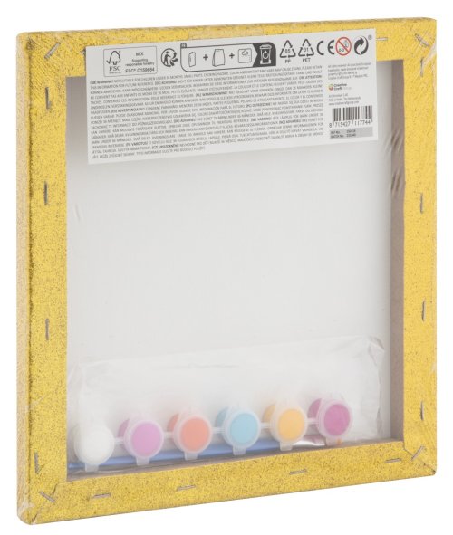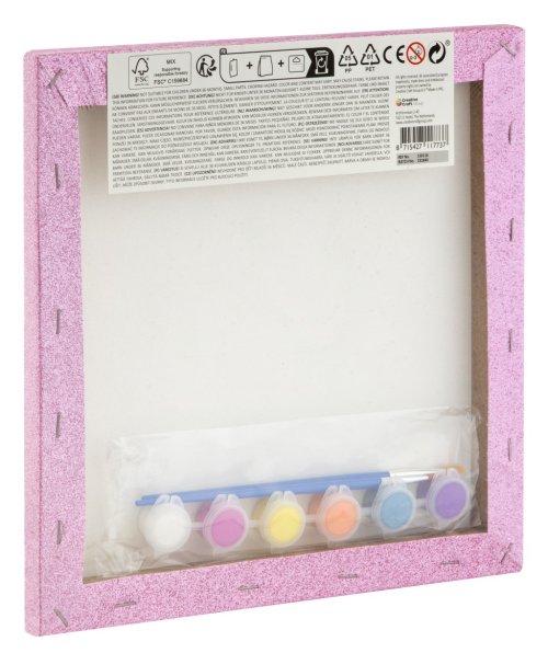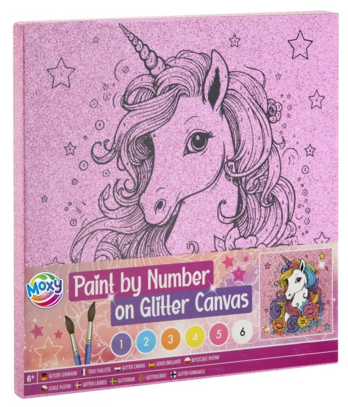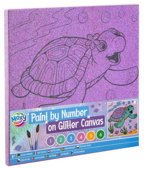Maľovanie podľa čísel na trblietavé plátno - súčasťou balenia trblietavé plátno s predtlačeným obrázkom, 6 vodových farieb a dva štetce. Tri rôzne druhy obrázkov – mandala, jednorožec a korytnačka,.