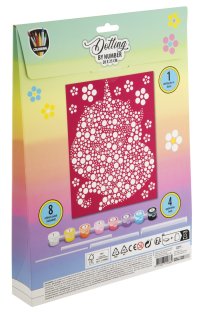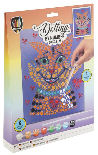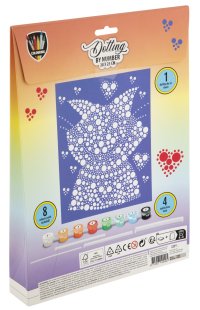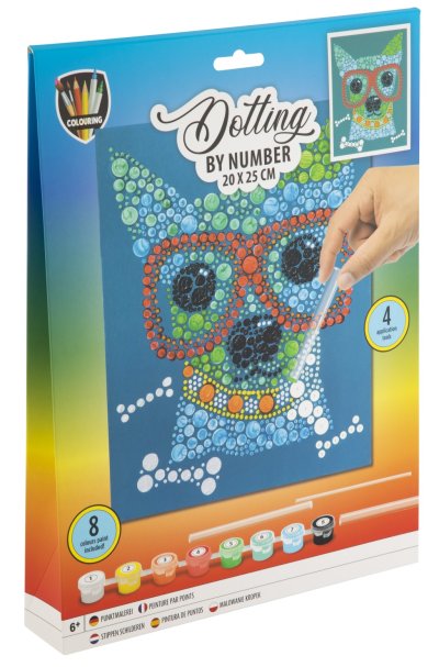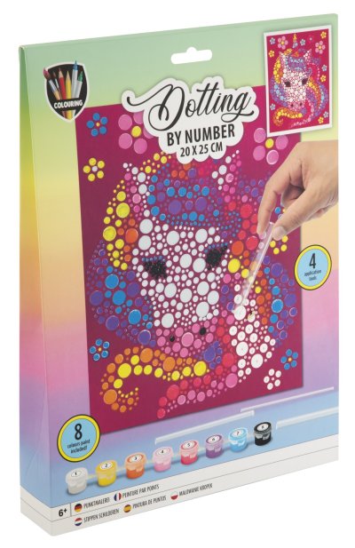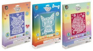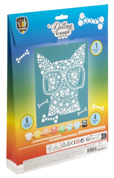 Maľovanie pomocou bodiek a čísel 20×25 cm – sada obsahuje obrázok, ktorý sa vyfarbuje pomocou bodiek podľa predtlačených čísel, súčasťou je 8 ks vodových farieb a aplikátory.