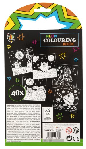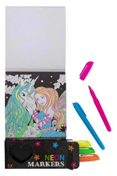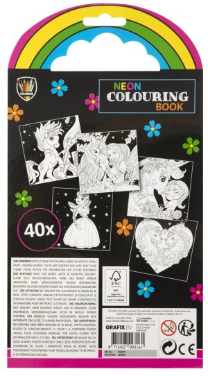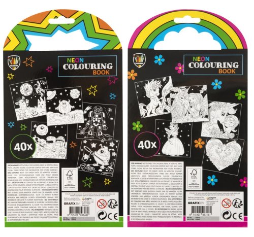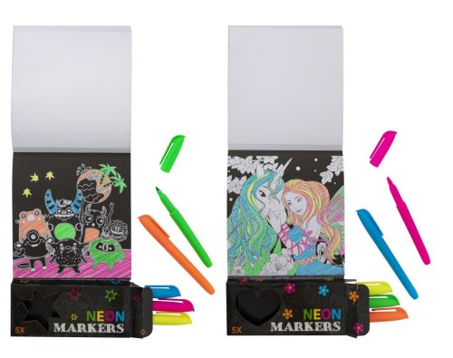 Sada omaľovánok – dva druhy. Sada obsahuje 40 ks listov s obrázkami + 5 fixiek v neónových farbách.