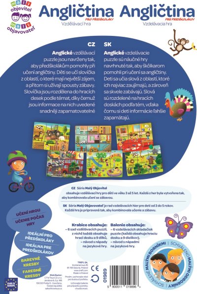 Anglické vzdelávacie puzzle sú navrhnuté tak, aby predškolákom pomohli pri učení angličtiny. Deti sa učia slovíčka z oblastí, o ktoré majú najväčší záujem a pritom si užívajú množstvo zábavy. Slovíčka sú rozdelené do hracích dosiek podľa tém, vďaka čomu sú informácie na nich uvedené ľahšie zapamätateľné. Balenie obsahuje: