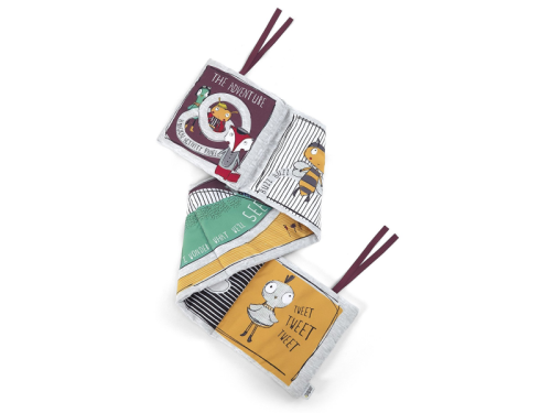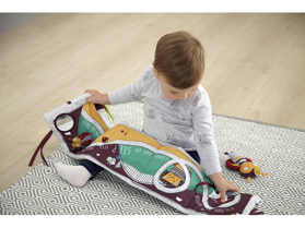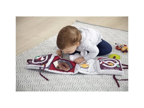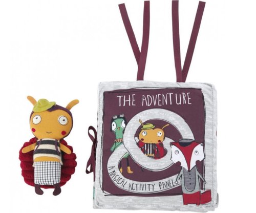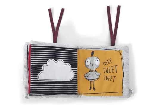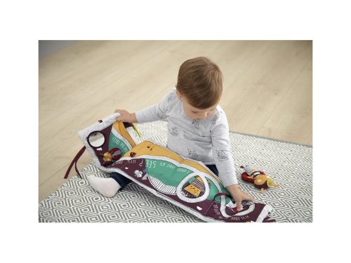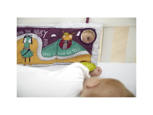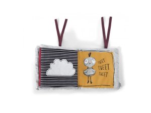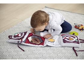 Obojstranný panel v podobe textilného leporela ponúka množstvo aktivít - zvuky, aktivované prejdením rúk cez prešitie, šuštiace časti, bezpečné zrkadlo, pískatko a hrkálku. Súčasťou je aj samostatná hračka v podobe roztomilej lienky. Umožňuje pripevnenie napr. na postieľku.