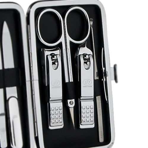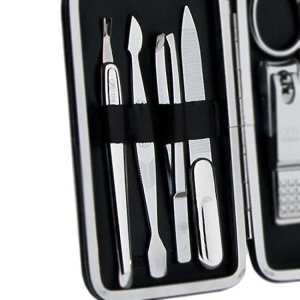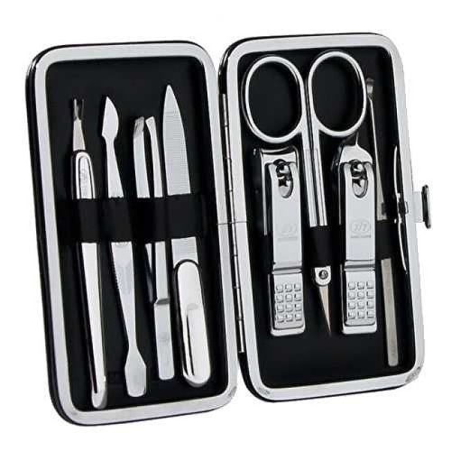 Strieborná manikúrna sada v puzdre obsahuje 8 nástrojov: dvoje klieštiky na nechty, manikúrna skosená pinzeta, nožnice na koži, pilník, manikúrna tyčinka, zatlačovač kožičky a zrezávač kožičky.
