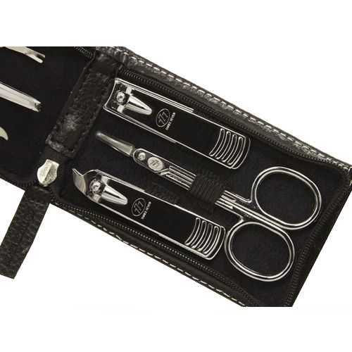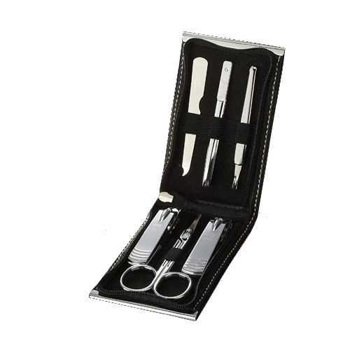 Čierna minimalistická manikúrna sada obsahuje 6 základných nástrojov: dvoje klieštiky na nechty, pinzeta manikúrna skosená, nožnice na koži, pilník, zatlačovač kožičky.