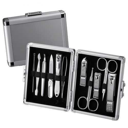 Veľká manikúrna súprava obsahuje 11 nástrojov pre kompletnú manikúru. V sade nájdete: štvory klieštiky na nechty, manikúrna skosená pinzeta, nožnice na nechty, nožnice pre deti (okrúhle špičky), pilník, manikúrna tyčinka, zatlačovač kožičky, zrezávač kožičky. Kvalitné pevné púzdro v kovovej imitácii. Precízne spracovanie všetkých nástrojov zo špeciálnej nerezovej ocele.
