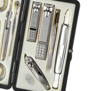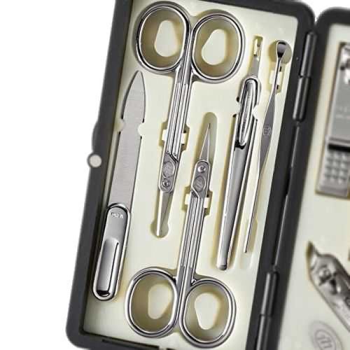 Manikúrna sada obsahuje 10 pozlátených nástrojov: troje kliešte na nechty, pinzetu skosenú, nožnice na nechty, nožnice pre deti, zafírový pilník, obojstranný zatlačovač kožičky, manikúrnu tyčinku, zrezávač kožičky.