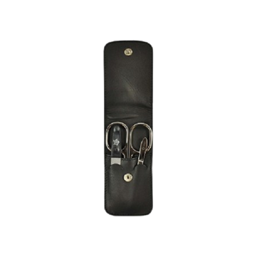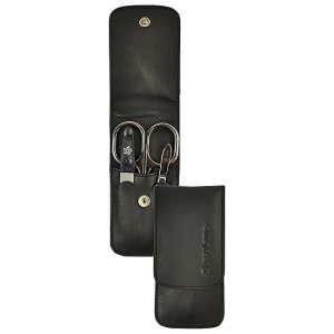 Cestovná manikúrová sada Pfeilring Solingen na úpravu nechtov. Manikúra je vyrobená z pravej kože a má zapínanie na skrytý patent. Nožnice sú kované z uhlíkovej ocele s lesklou niklovou povrchovou úpravou (proti reznutiu).