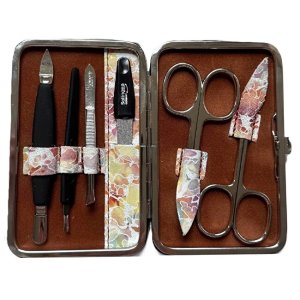 Manikúrová sada v kvetinovom dizajne obsahuje kvalitné manikúrové nástroje na úpravu nechtov. Rámčeková manikúrová sada z pravej kože obsahuje nožnice na nechty, nožnice na nechtovú kožičku, zafírový pilníček na nechty 8 cm, šikmú pinzetu, vidličku na úpravu nechtového lôžka a obojstranný manikúrový nástroj.