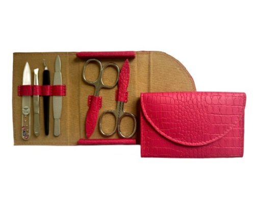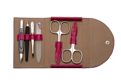Ružová manikúrna sada v koženom púzdre pre dokonalú úpravu nechtov. Nástroje sú vyrobené z niklu.