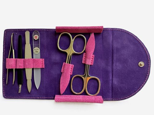 Ružovo-fialová manikúrová sada v trojdielnom puzdre s guľatou chlopňou zdobená tromi kvietkami. Nástroje sú vyrobené z niklu.