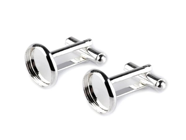 Manžetové gombíky s lôžkom. Do lôžka môžete vlepiť kabošon. Alebo lôžko zalejte krištáľovou živicou. Steny lôžka sú mierne vypuklé, živica bude skvele držať. Do živice môžete zaliať napr. trblietky či drobné korálky. Alebo do lôžka vlepte obrázok a naň následne živicu nalejte. Lôžko je hlboké 1,7 mm. Vnútorný priemer má 12 mm, vonkajší 14 mm. Steny mištičky sa ľahko zatvárajú dovnútra.