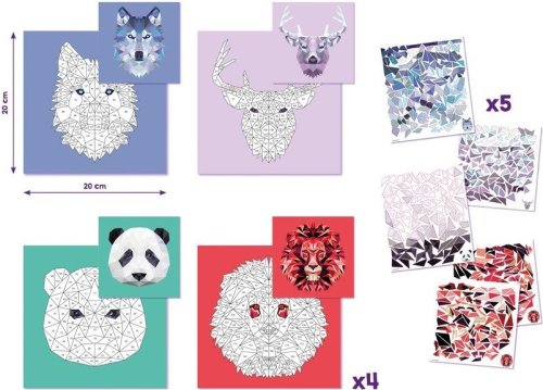 Kreatívna sada na vytváranie nádherných origami portrétov zvierat pomocou technikyčíslovaných nálepiek. Škálovateľné = 4 karty pre 4 úrovne obtiažnosti. Sada obsahuje 4 kartónové karty (20 x 20 cm), 5 hárkov samolepiacich etikiet, 1 kartónový klin, ktorý sa zmení na stojan, návod na použitie. Úspech zaručený: nasledujete čísla uvedené na samolepkách a neurobíte chybu.