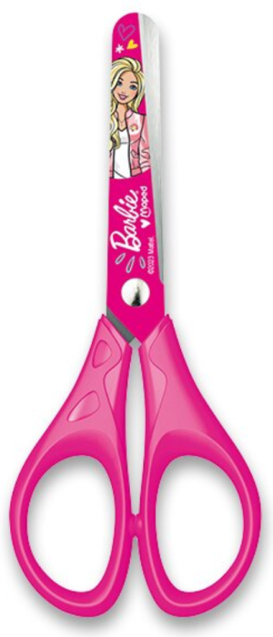 atraktívny dizajn s motívom obľúbenej bábiky Barbie, zaoblené špičky, dekorované čepele z brúsenej nerezovej ocele, 3D ergonomická rukoväť prispôsobená detským rúčkam.