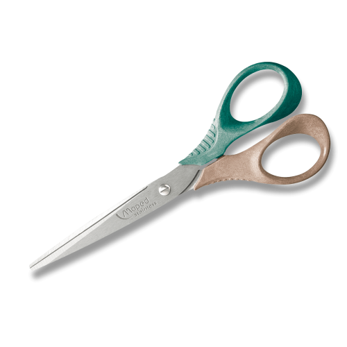 Nožnice, veľkosti 16 cm. Čepele z brúsenej nerezovej ocele.Ostr é špičky pre presné strihanie. 3D ergonomická rukoväť vyrobená z 50% zmesi drevného vlákna s certifikáciou FSC. Recyklovateľný kartónový obal.