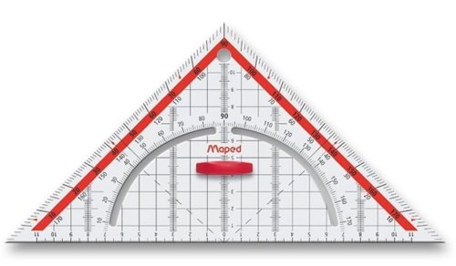 Trojuholník s geometrickými funkciami, 16 cm preponou a držadlom. 4 funkcie: trojuholník so stupnicou symetrické čiary paralelné čiary uhlomer
