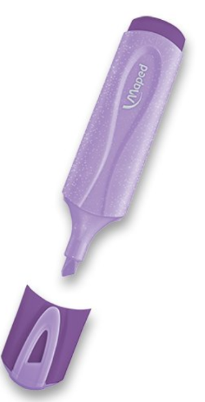 Plochý zvýrazňovač v štyroch pastelových farbách s trblietavými efektmi.