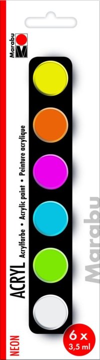 Marabu akrylová farba neónová sada 6 x 35 ml Farby je možné miešať a riediť vodou, rýchloschnúci, brilantný matný povrch. Na dosiahnutie najlepších výsledkov naneste na svetlé pozadie alebo použite základný náter. Vhodný na rôzne podklady ako plátno, maliarske dosky, papier, karty, drevo atď. Lakovacie zariadenie ihneď po použití očistite vo vode. Obsah: 6 x 3,5 ml akrylovej farby (Fluorescent-citrón, Fluorescent-oranžová, Fluorescent-ružová, Fluorescent-modrá, Fluorescent-zelená, Primer)