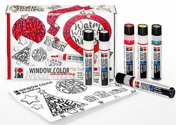 Sada zlupovacích farieb na zdobenie hladkých povrchov. Sada farieb okien "Handlettering Xmas" • odnímateľná priehľadná farba • Na vodnej báze • vysoký lesk • žiarivé farby • Mäkká lakovacia fľaša s jemnou špičkou zaručuje príjemnú prácu • Veľmi jednoduché použitie: maľovanie, odlepovanie, hotovo! Sada obsahuje: - 6 x Window Color zábava a fantázia 25 ml vo farbách: trblietavé zlato, trblietavé striebro, jedľa zelená, rubínovo červená, biela, kontúra čierna - 1 x DIN A3 omaľovánka so 44 motívmi (zimné ručné nápisy a krásne vianočné motívy) - 1 x maliarska fólia A4 Príklady použitia: - na zdobenie okien, zrkadiel, skla, porcelánu, dlaždíc a mnohých ďalších hladkých povrchov - vykúzlite skvelé motívy ručného písma na oknách, fľašiach, pohároch a iných hladkých povrchoch