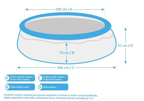 Upozornenie: Uvedené rozmery bazéna sú iba orientačné a môže ich ovplyvniť napríklad rovnosť podkladu, objem napustenej vody alebo nafúknutie goliera. Povolená výrobná odchýlka je 5 %.