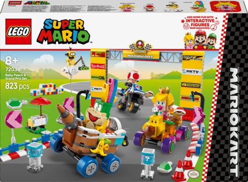 Postavte si dráhu a vozidlá Mario Kart a pretekajte (a urobte si prestávku na zmrzlinu) so setom LEGO Super Mario: Mario Kart - Baby Peach a sada Grand Prix panciera, Toadov vozík so sladkosťami, štartovú bránu, Lakituov oblak a stupne víťazov Umiestnite figúrku LEGO® Mario, LEGO® Luigi alebo LEGO® Peach (figúrky nie sú súčasťou balenia) do vozidiel, na Akčný prvok alebo na 2 Item Boxes a vychutnajte si digitálne reakcie
