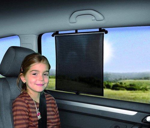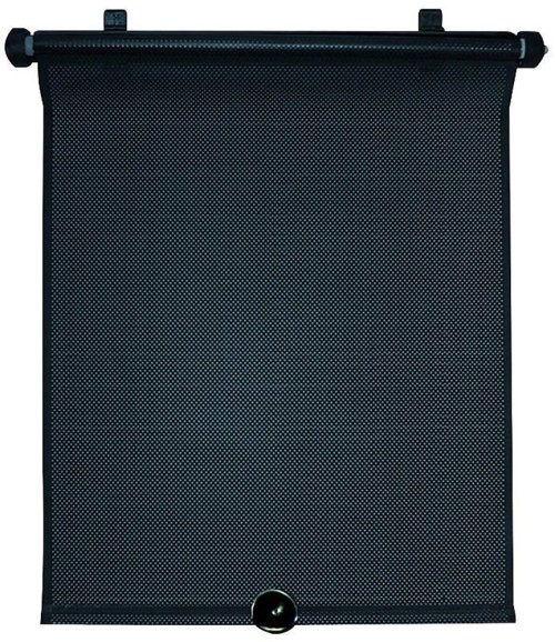 Tieniaca roletka na okno automobilu. Slnečnú clonu je možné na okno upevniť tromi prísavkami alebo dvoma nastaviteľnými háčikmi. Veľkou prednosťou tienidla je, že ho možno zablokovať v ľubovoľnej pozícii a stlačením tlačidla sa roletka jednoducho zroluje. Rozmery cca 33x56 cm.