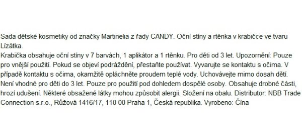 MARTINELIA Candy lollipop Sada detskej kozmetiky. Obsahuje očné tiene v 7 farbách, 1 aplikátor a 1 rúž. Pre deti od 3 rokov.