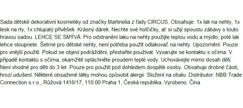 MARTINELIA Circus Súprava lak na nechty a lesk na pery s kľúčenkou. Obsahuje: 1x lak na nechty, 1x lesk na pery, 1x chlpatý prívesok. Na odstránenie laku na nechty použite teplú vodu a mydlo, potom lak ľahko zlúpnete. Šetrné pre detské nechty, nie je potrebné použiť odlakovač na nechty.