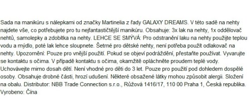 MARTINELIA Galaxy dreams Sada na manikúru. Obsahuje: 3x lak na nechty, 1x oddeľovač nechtov, samolepky a zdobidlá na nechty. Na odstránenie laku na nechty použite teplú vodu a mydlo, potom lak ľahko zlúpnete. Šetrné pre detské nechty, nie je potrebné použiť odlakovač na nechty.
