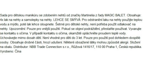 MARTINELIA Magic ballet Sada na manikúru. Obsahuje: 4x lak na nechty a samolepky na nechty. Na odstránenie laku na nechty použite teplú vodu a mydlo, potom lak ľahko zlúpnete. Šetrné pre detské nechty, nie je potrebné použiť odlakovač na nechty.