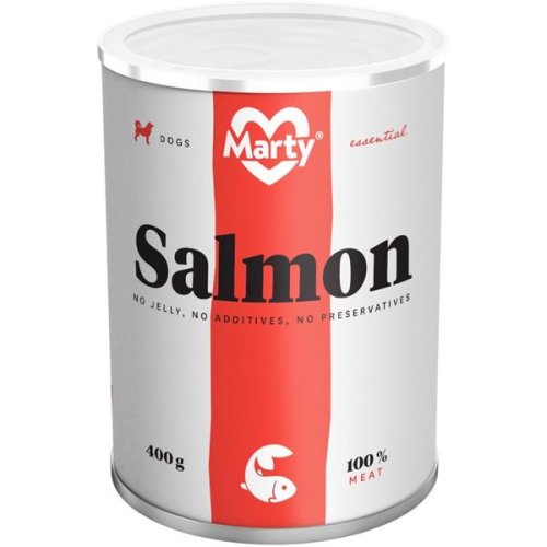MARTY konzervy pre psov zo 100% mäsa sa vyznačujú stopercentnou živočíšnou zložkou bez obsahu ryže, sóje, múky či zemiakov, bez pridaných konzervantov a dochucovacích či farbiacich prísad. Obsah každej MARTY konzervy je tvorený zo 100% mletého mäsa, dominantnou zložkou je druh mäsa uvedený v názve krmiva. Krmivá MARTY tak rešpektujú prírodu a prirodzené potreby vášho mäsožravého miláčika, ktorého umožňujú kŕmiť naozajstným mäsom! Zloženie: Losos (min. 50 %), mäso a vedľajšie produkty živočíšneho pôvodu (hovädzie mäso, kuracie mäso, bravčové mäso). Analytické zložky: Proteín 13 %, hrubé oleje a tuky 6 %, hrubá vláknina 0,5 %, hrubý popol 2,5 %, vlhkosť 75 %. Vysoký prirodzený obsah vitamínov A, D, E a aminokyselín lyzín, metionín a cystín. Dávkovanie: