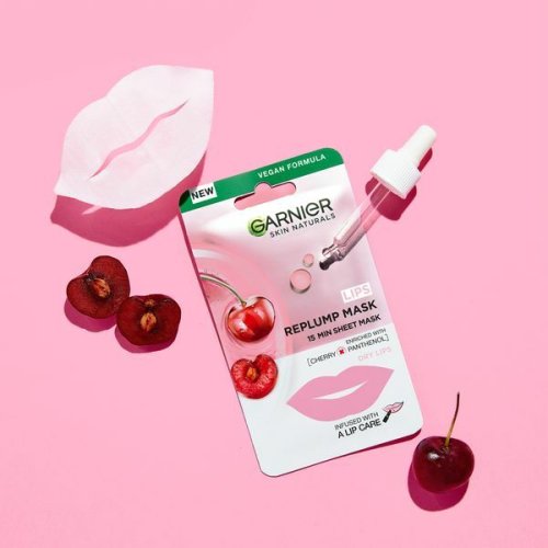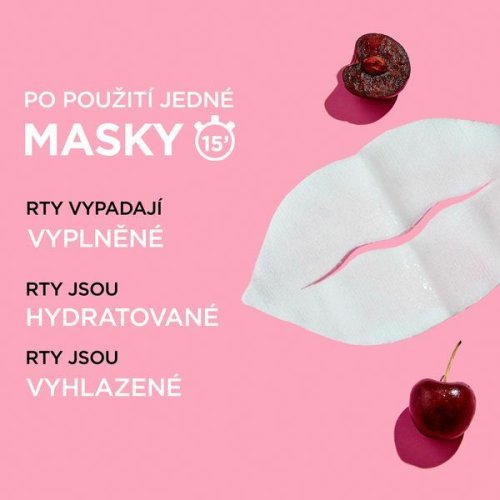 Vyplňujúca textilná maska na pery s výťažkom z čerešne a panthenolom.