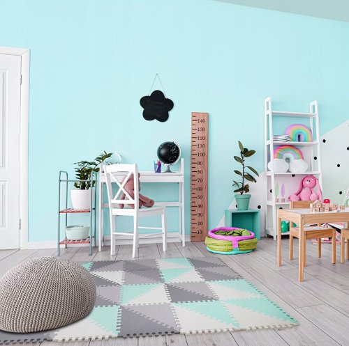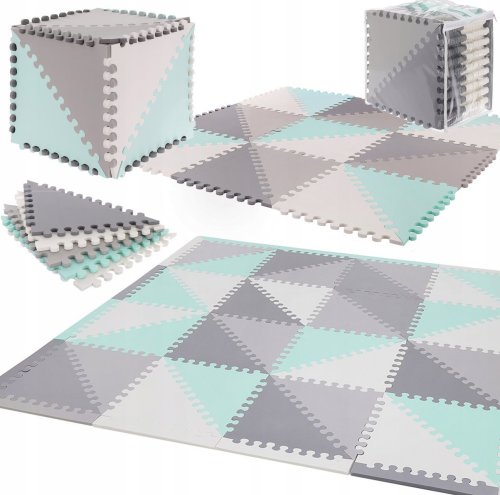 bezpečná a mäkká podložka je umývateľná penové puzzle tlmí hluk a izoluje od chladu ideálny ako hrací koberec nielen do detských izieb puzzle má vrúbkovaný povrch hrúbka penového puzzle je 1 cm balenie obsahuje 40 trojuholníkov a 18 okrajových dielov 32,5 x 32, štvorce z dvoch trojuholníkov)