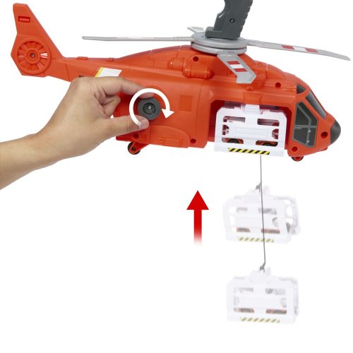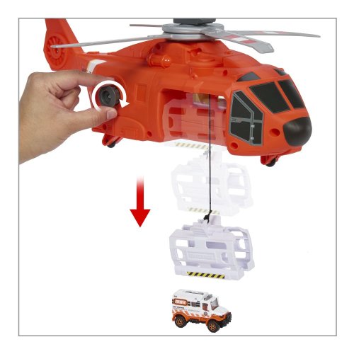 Leťte so záchranným vrtuľníkom Matchbox™ na pomoc! Táto cca 40 cm veľká helikoptéra má vrtuľu ovládanú deťmi, funkčný navijak a je možné ju premeniť na riadiacu jednotku umožňujúcu plniť záchrannú misiu. Stlačením páčky na rukoväti aktivujete vrtuľu a "vletíte" na miesto zásahu. Zo vzduchu spustíte navijak a zdvihnete autíčko v mierke 1:64, ktoré prenesiete na palubu a zachránite tak situáciu. Súčasťou je kovová sanitka v mierke 1:64.