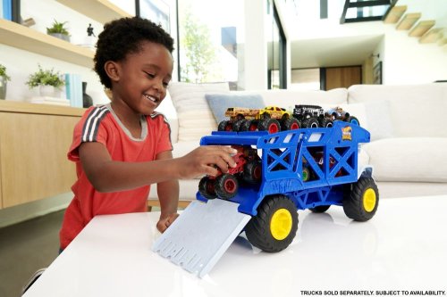 Predstav si vzrušenie z toho, keď vidíš veľkého nosorožca - a teraz si predstav, že Hot Wheels® Monster Trucks Nosorožčia preprava truckov zaručí úplne rovnaké nadšenie pri každej hre! Tento ťahač inšpirovaný nosorožcami môže štýlovo prepravovať stádo Monster Trucks alebo Hot Wheels®. Do ťahača s masívnymi otáčacími sa kolieskami a jasne žltým rohom vpredu môžeš naložiť 12 Monster Trucks v mierke 1:64 alebo 32 angličákov Hot Wheels® v mierke 1:64 (každé auto sa predáva samostatne). Naspäť do prevádzky potom autá vypustíš cez zadnú sklápaciu rampu. Je to skvelý darček pre deti od 3 rokov, ktoré chcú udržať svoju zbierku Monster Trucks a Hot Wheels® pohromade zábavným spôsobom. Farby a vzhľad výrobku sa môžu líšiť.