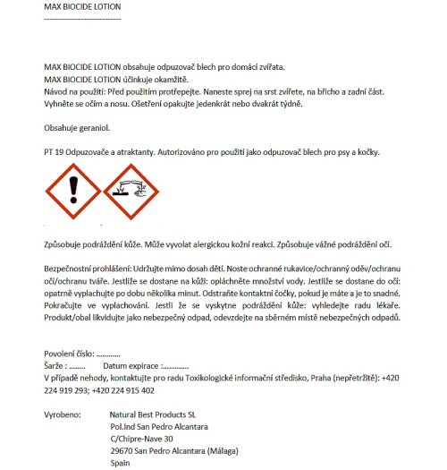Zloženie: Geraniol 3% (Geraniol má preventívny a liečebný účinok na vonkajšie parazity, kliešte a blchy).