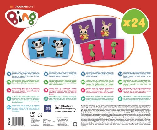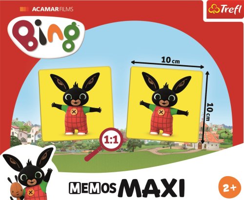 Memos Maxi je skvelá pamäťová hra pre všetky deti. Cieľom hry je pozbierať čo najviac rovnakých žetónov – klasické pexeso s veľkými dielikmi (10 x 10 cm). Balenie obsahuje 24 ks s motívom zo seriálu Bing Rozmer krabice: 37 x 29 x 6 cm Vhodné pre deti od 2 rokov