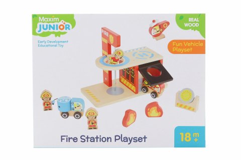 Hasičská stanica. Rozmer: 13x26x20cm Set obsahuje: Budovu s garážou a hasičskou tyčou, 2x auto, 1x vrtuľník, 3x figúrka hasiča, reflektor, 2x oheň. Vláčikodráhy a doplnky Maxim je možné kombinovať so všetkými ďalšími drevenými vláčikodráhami na trhu. Pre deti od 18 mesiacov.