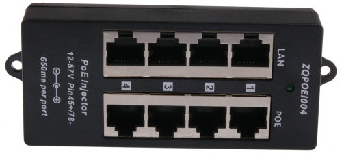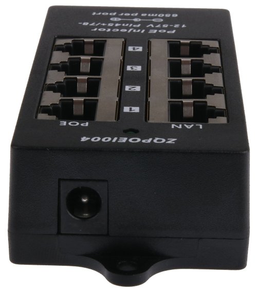 Popis produktu POE-BOX4 je pasívny PoE injektor, ktorý je vhodný pre napájanie až 4 zariadení. Do konektorov s označením "LAN" sa pripájajú ethernetové porty bez napájania napr. switch, na opačnú stranu "POE" sa pripájajú zariadenia využívajúce pasívne PoE - napájanie po eth. kábla. Na napájanie sa využívajú dva voľné páry ethernetového kábla: 4,5 (kladný pól) a 7,8 (záporný pól). Napájanie sa pripája štandardným napájacím konektorom o veľkosti 2.1/5.5mm.