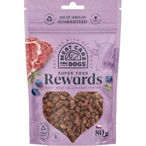 Rewards Dog hovädzie s čučoriedkami a tymianom je maškrta zo skutočného čerstvého mäsa. Hovädzie mäso v kombinácii s čučoriedkou s vysokým množstvom vitamínov a tymianom pre lepšie trávenie.