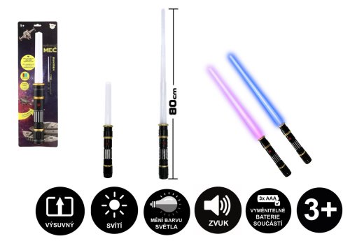 Skladací meč pri pohybe mení zvuk, pri zasiahnutí cieľa vydáva zvuk. Svietia a menia farby. Na batérie 3x AAA, ktoré sú súčasťou hračky. Rozmer meča: 80 cm Vhodné pre deti od 3 rokov