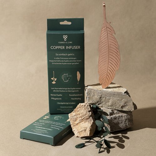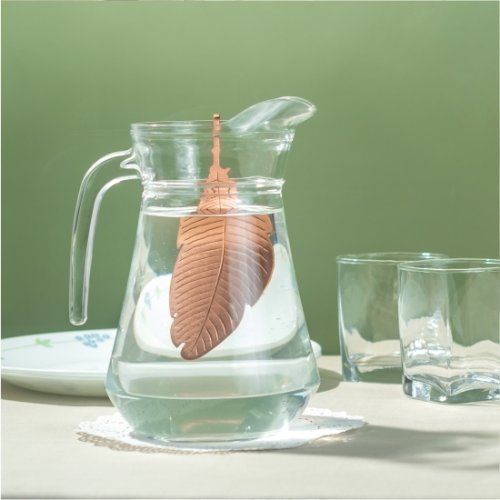 Medený infusér do vody v tvare listu je pútavý doplnok, ktorý jednoducho zavesíte do džbánu s vodou a necháte ponorený ideálne cez noc (alebo aspoň 4 hodiny).