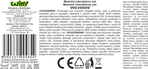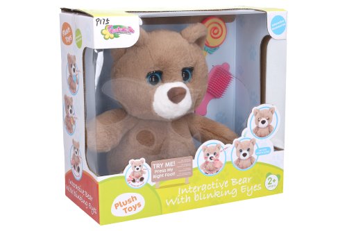Medveď interaktívny set. Veľkosť v sede 27 cm. Zvukové efekty a žmurkanie stlačením ľavej ruky a priložením predmetov alebo dotykom (stlačením) inej časti tela - hlavy, ňufáka (kýchania), hrude (smiech). 3x rýchly dotyk hlavy - zavrie oči a spí. Priloženie lízanky a rybky k papuľke - papanie. 3xAA batérie súčasťou. Prepínač on/off/try me v zadnej časti hlavy. Súčasťou hrebeň na česanie.