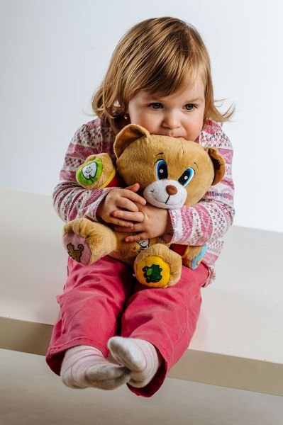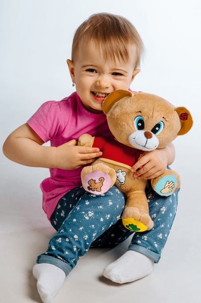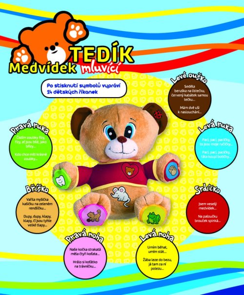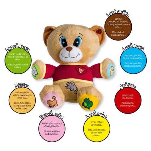 Veselý medvedík Tedík naučí deti 14 známych českých riekaniek napr. Paci, paci, pacič ky ... Mám dve uši na počúvanie ... Čistím zúbky riady, rí zy ... atď . Stačí stlačiť symbol a počúvať. Vhodný pre deti od 12 mesiacov, veľkosť 30 cm.