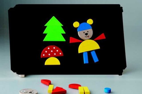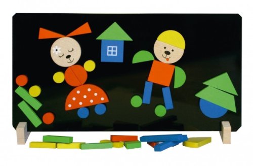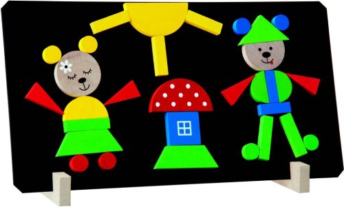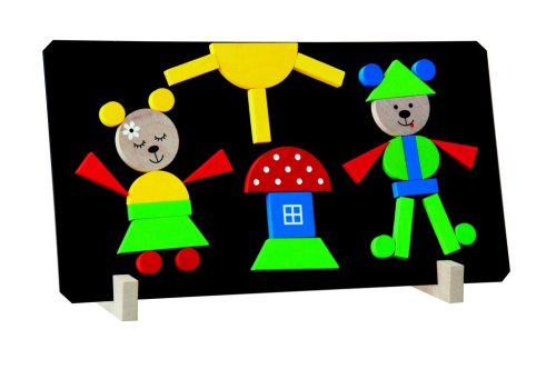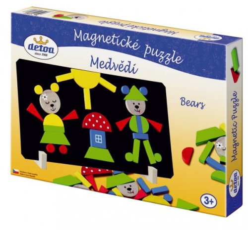 Puzzle medvede obsahujú magnetickú tabuľku, stojan a 37 drevených dielikov s magnetom, z ktorých je možné zostaviť rôzne obrázky. Pomáha rozvíjať jemnú motoriku a predstavivosť detí. Balené v krabici z tvrdého papiera. Nevhodné pre deti do 3 rokov. Obsahuje malé časti