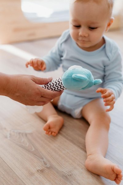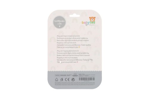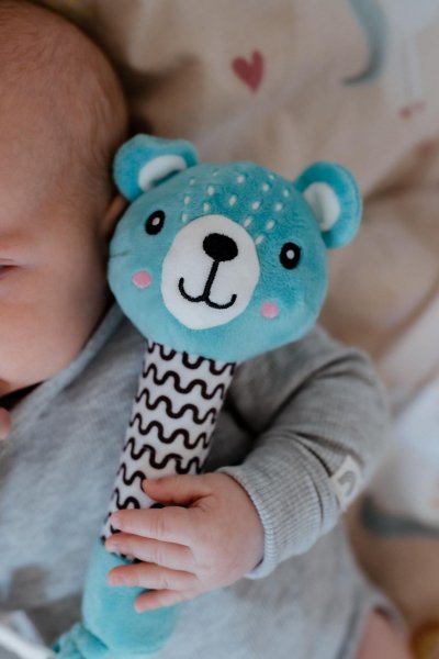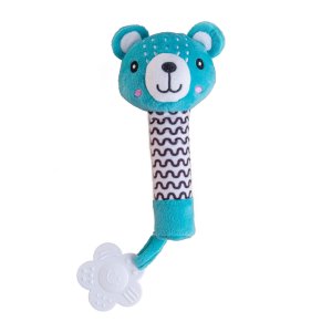 Roztomilý plyšový medvedík je ideálna prvá hračka pre bábätká už od narodenia. Vďaka svojmu dlhému, mäkkému telíčku sa skvele drží v malých ručičkách a pri stlačení vydáva jemný pískací zvuk, ktorý podporuje sluchové vnímanie a prirodzene zaujme pozornosť bábätka. Na konci držadla je umiestnené mäkké plastové hryzátko v tvare kvietku, ktoré pomáha uľaviť citlivým ďasnám pri raste prvých zúbkov. Kontrastné vzory na telíčku podporujú vizuálne vnímanie a rozvoj zraku. Medvedík je vyrobený z hebkého, bezpečného plyšu, ktorý je vhodný pre najmenšie deti. Hračka je navyše certifikovaná v SR, takže spĺňa prísne bezpečnostné normy.