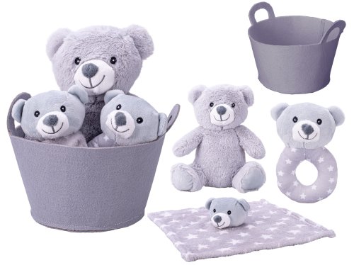Medvedík plyšový 20 cm šedý sediaci s hrkálkou 13 cm a zaspávačikom v košíku