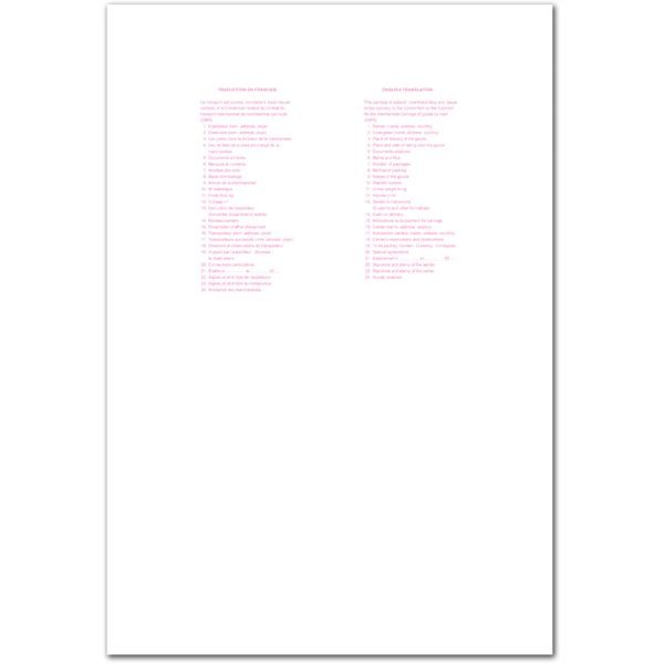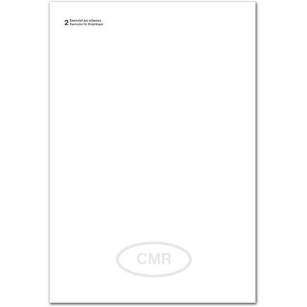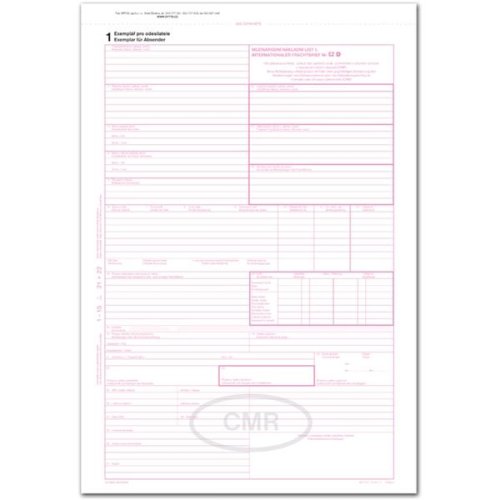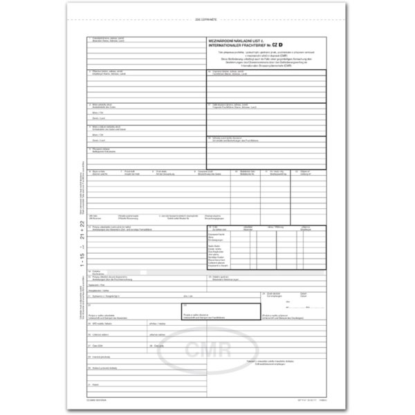 Náležitosti podľa Dohovoru o prepravnej zmluve v medzinárodnej cestnej nákladnej doprave Samoprepisovací Číslovaný Formát A4 na výšku Obsahuje 5 listov odtržiteľných perforácií v hornej časti Česko-nemecká …